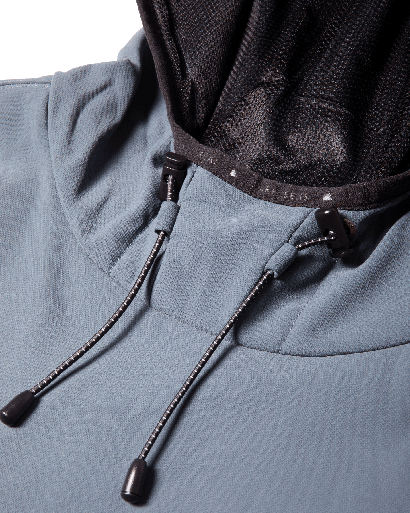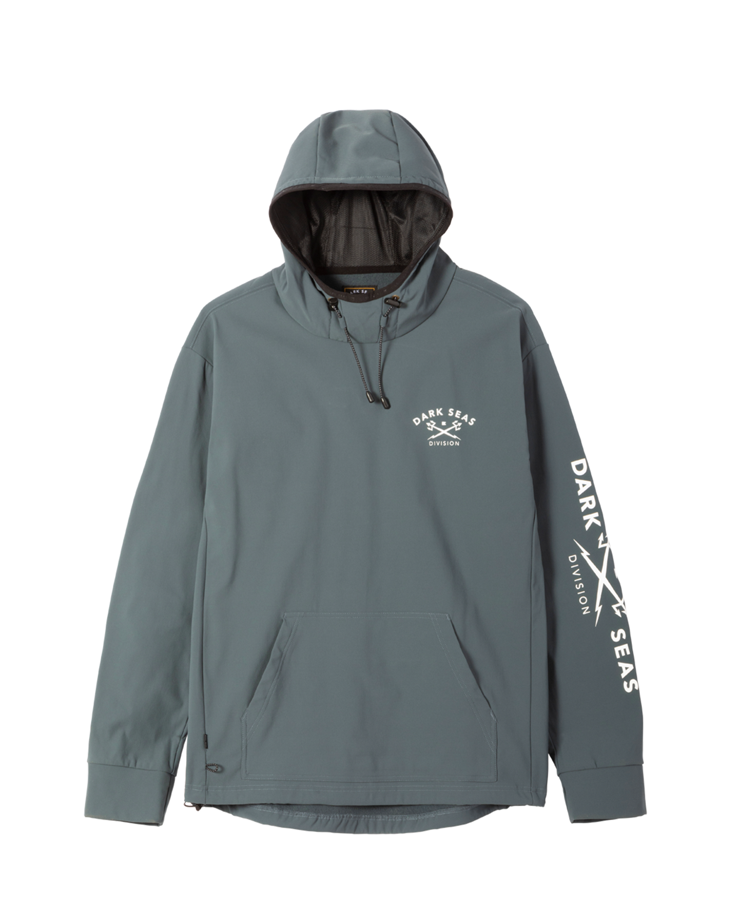 Nylon shock cord hood cinchLogo prints at chest and backDark Seas woven label branding93% poly / 7% spandex