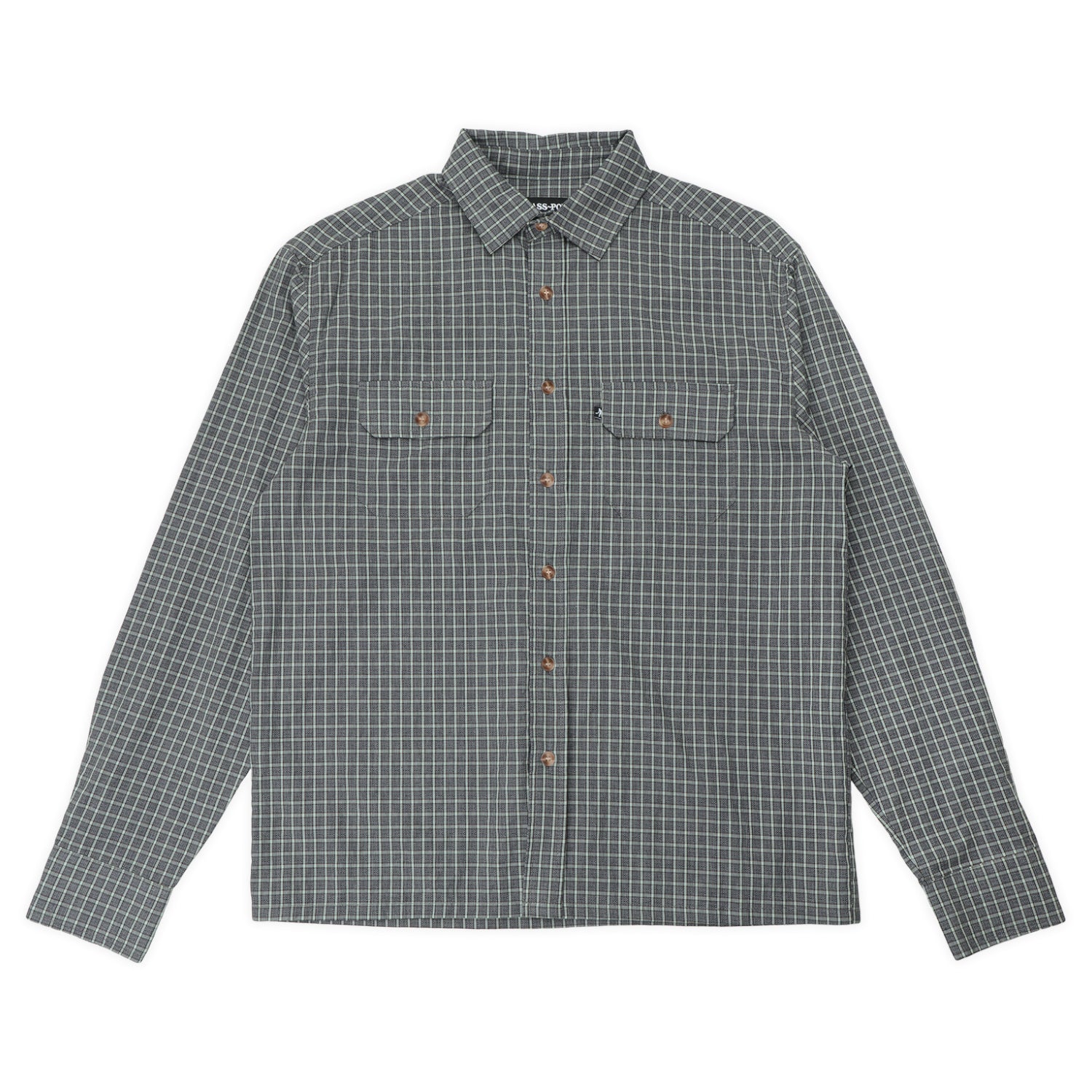 Pass~Port Workers Check Long Sleeve Shirt in Grey from range #47. The Workers long sleeve button up shirt is made from 100% lightweight cotton shirting and features double button down pockets on front with a woven label, recycled buttons & digger pip.